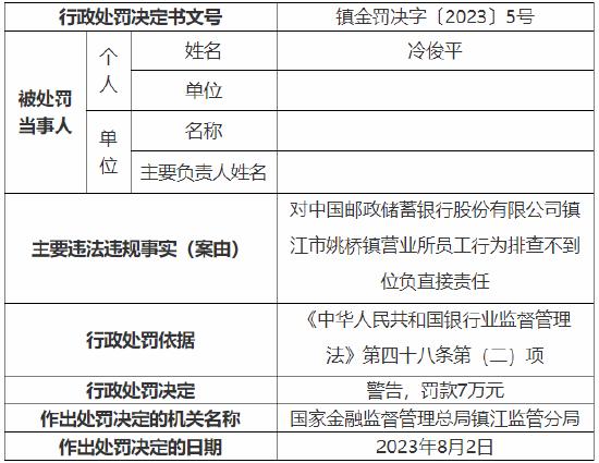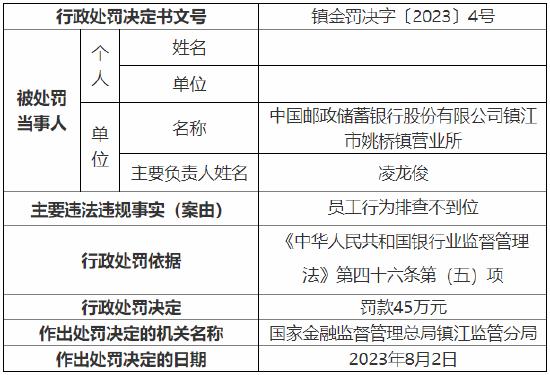 8月7日金融一线消息,据国家金融监督管理总局网站发布的行政处罚信息公开表显示,邮储银行镇江市姚桥镇营业所因员工行为排查不到位,被国家金融监督管理总局镇江监管分局罚款45万元;同时,冷俊平、贾宏祥、章瑶慧三人对上述违法行为负直接责任,分别被监管处罚。