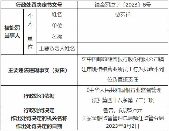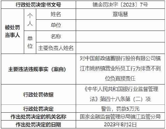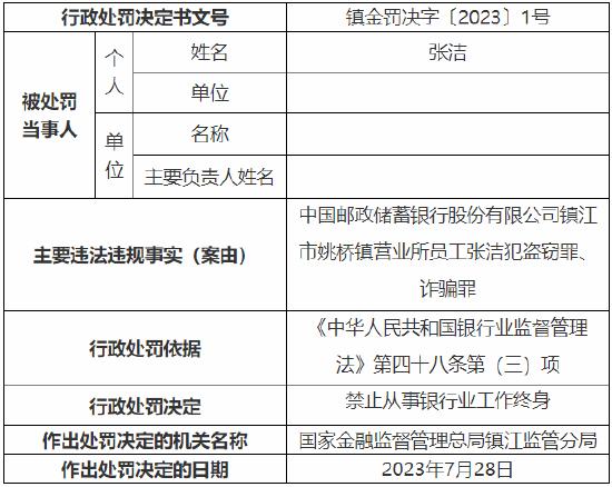 镇金罚决字〔2023〕1号显示,邮储银行镇江市姚桥镇营业所员工张洁犯盗窃罪、诈骗罪,被监管禁止从事银行业工作终身。