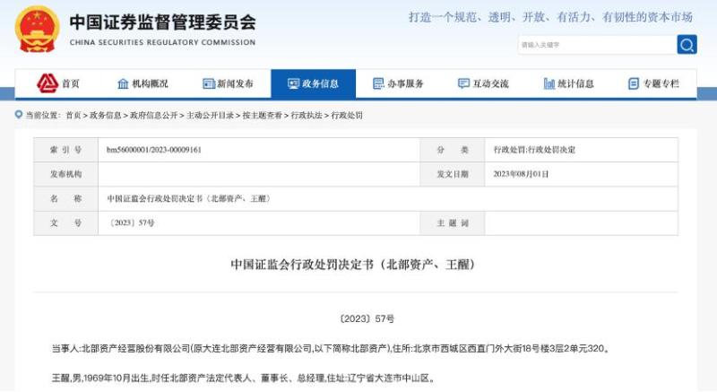 证监会日前更新披露的一则行政处罚决定书显示,证监会对北部资产经营股份有限公司(原大连北部资产经营有限公司,以下简称北部资产)违反证券法律法规行为进行了立案调查、审理,决定对北部资产处以警告;对时任北部资产法定代表人、董事长、总经理王醒处以警告,并处3万元罚款;撤销北部资产经营股份有限公司业务资格。