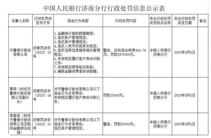另外,葛萍(时任齐鲁银行股份有限公司副行长)对该行未按规定履行客户身份识别义务负有责任,被罚款1.5万元;李振军(时任齐鲁银行股份有限公司互联网金融部总经理)对该行违反商户管理规定负有责任,被警告并???/span>5万元。