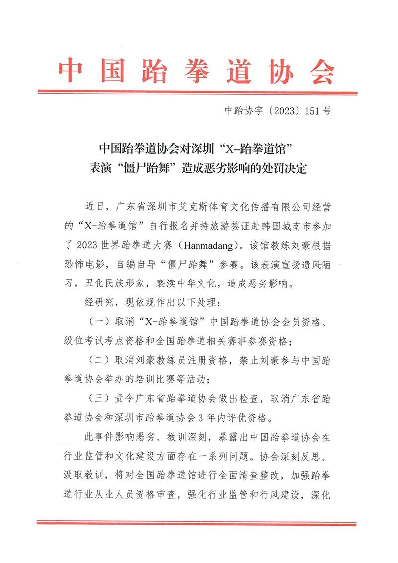 中国跆拳道协会对深圳“X-跆拳道馆”表演“僵尸跆舞”造成恶劣影响的处罚决定