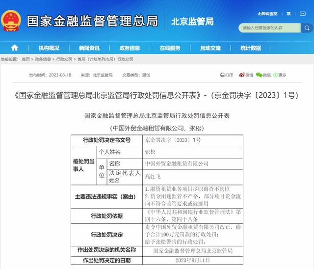 日前,国家金融监管总局网站公布一则处罚信息显示,外贸金租因融资租赁业务项目尽职调查不到位等违规事实,被金融监管总局北京监管局处以罚款100万元。同时,外贸金租部分违规事实责任人被警告。