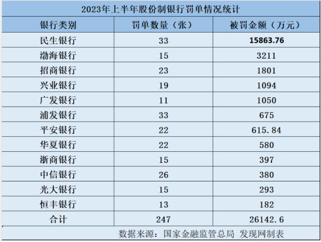 股份制银行被罚2.61亿元民生银行被罚超1.5亿元
