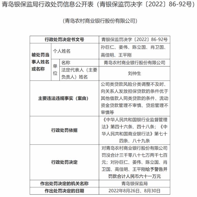 青岛银保监局开具的罚单显示,2022年8月26日,青岛农商银行因公司类贷款风险分类调整不及时、向关系人发放担保贷款的条件优于其他借款人同类贷款的条件、流动资金贷款管理不审慎、贷后管理不审慎等6项违法违规行为被罚,罚没合计3087.27万元;对相关责任人孙巨仁、姜伟、陈立国、肖卫国、高佳明、王平刚给予警告并??詈霞?/span>61万元。