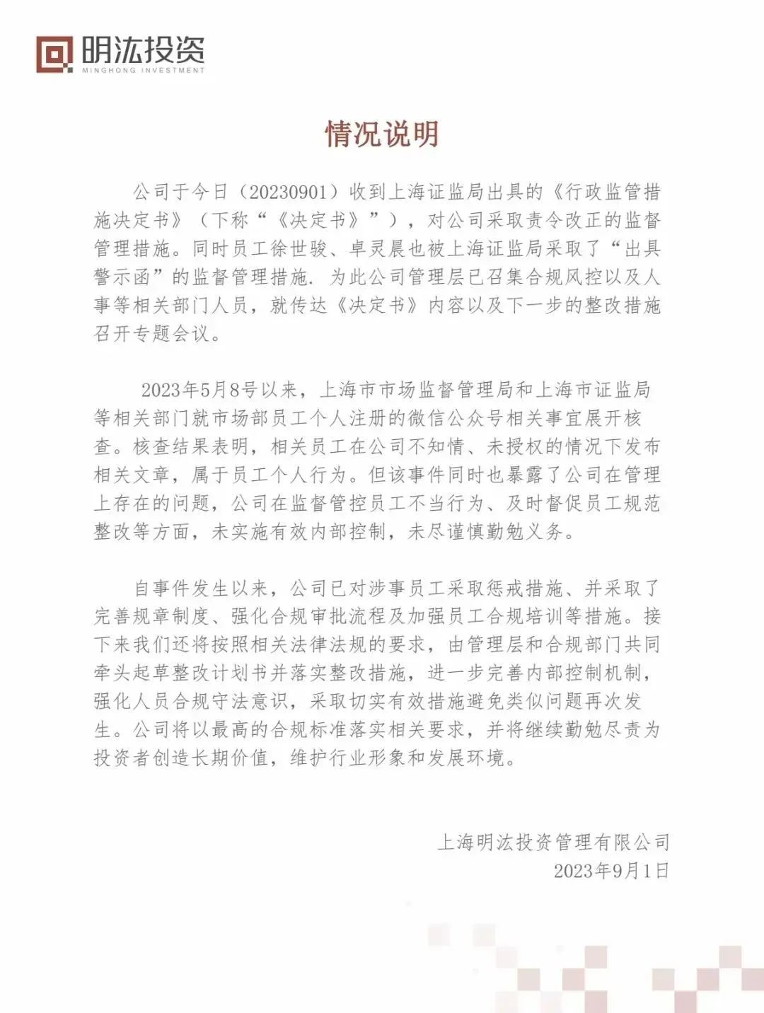 明汯称,2023年5月8号以来,上海市市场监督管理局和上海市证监局等相关部门就市场部员工个人注册的微信公众号相关事宜展开核查。
