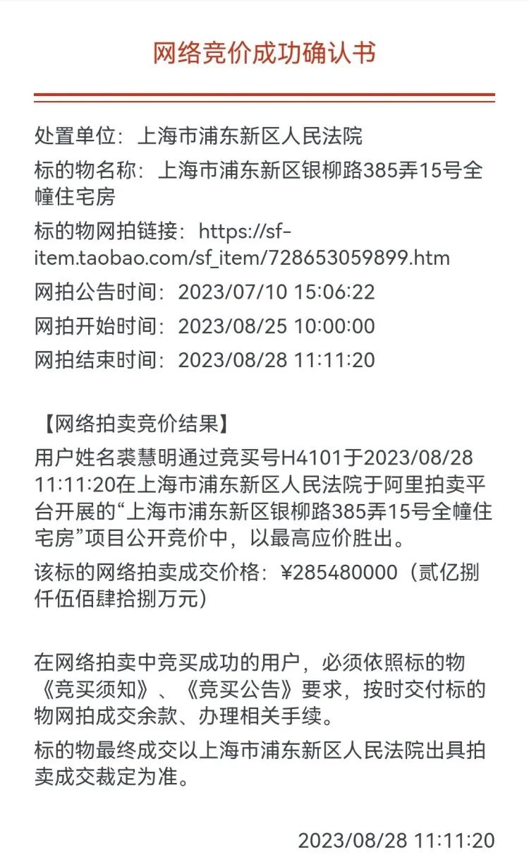 值得一提的是,8月28日,淘宝阿里拍卖平台信息显示,上海某住宅区以2.85亿成交,流传出网络竞价成功确认书显示,用户姓名裘慧明通过竞买以最高应价胜出。