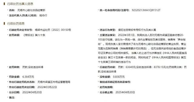 据媒体报道,茅台工作人员称,“酱香拿铁”是茅台与咖啡品牌的第一次联名合作。但实际上,市场上早已出现了茅台咖啡。某眼查App显示,曾有商家因自制“茅台咖啡”被处罚。2022年,无锡市心甜化妆品经营部在未领取食品经营许可的情况下销售“茅台咖啡”,且在店内设置“专属特调茅台咖啡 53°¥128”“咖啡天花板玖号 53°飞天茅咖”等宣传牌。由于无法提供食品经营许可证及茅台公司的相关授权,当事人因涉嫌违反《中华人民共和国食品安全法》和《中华人民共和国商标法》,被无锡市梁溪区市场监督管理局没收违法所得8378.15元,并处以???/span>63640元。