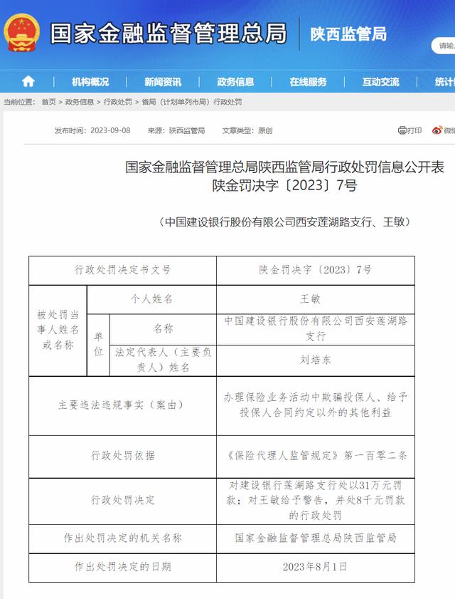 一份“陕金罚决字〔2023〕7号”的行政处罚信息公开表显示,中国建设银行股份有限公司西安莲湖路支行存在“办理保险业务活动中欺骗投保人、给予投保人合同约定以外的其他利益”的违法违规行为,根据《保险代理人监管规定》第一百零二条规定,国家金融监督管理总局陕西监管局对中国建设银行莲湖路支行处以31万元??睿欢韵喙氐笔氯送趺舾杈?,并处8千元罚款的行政处罚。