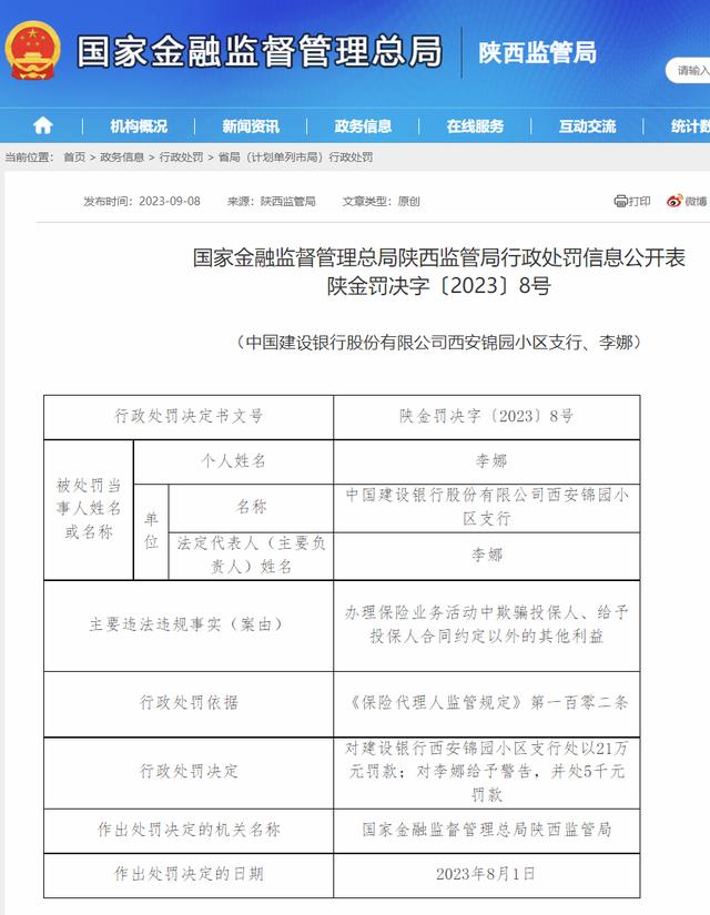 另据“陕金罚决字〔2023〕8号”显示,中国建设银行股份有限公司西安锦园小区支行同样存在“办理保险业务活动中欺骗投保人、给予投保人合同约定以外的其他利益”的违法违规事实,根据《保险代理人监管规定》第一百零二条规定,国家金融监督管理总局陕西监管局对中国建设银行股份有限公司西安锦园小区支行开出21万元罚单;对相关当事人李娜给予警告,并处5千元???。作出处罚决定的日期均为2023年8月1日。