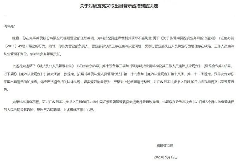 《关于对先锋期货股份有限公司福州营业部采取出具警示函措施的决定》显示,先锋期货福州营业部存在以下问题:一是营业部负责人为期货配资提供便利并获取不正当利益;二是营业部部分员工存在廉洁从业问题。
