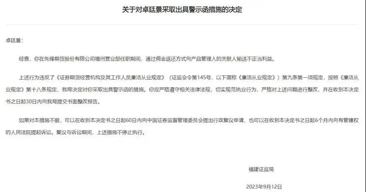 福建证监局表示,上述问题反映出先锋期货福州营业部从业人员执业行为管理存在缺陷,工作人员廉洁从业管理不到位。按照《期货公司监督管理办法》和《廉洁从业规定》相关规定,决定对先锋期货福州营业部采取出具警示函的措施。