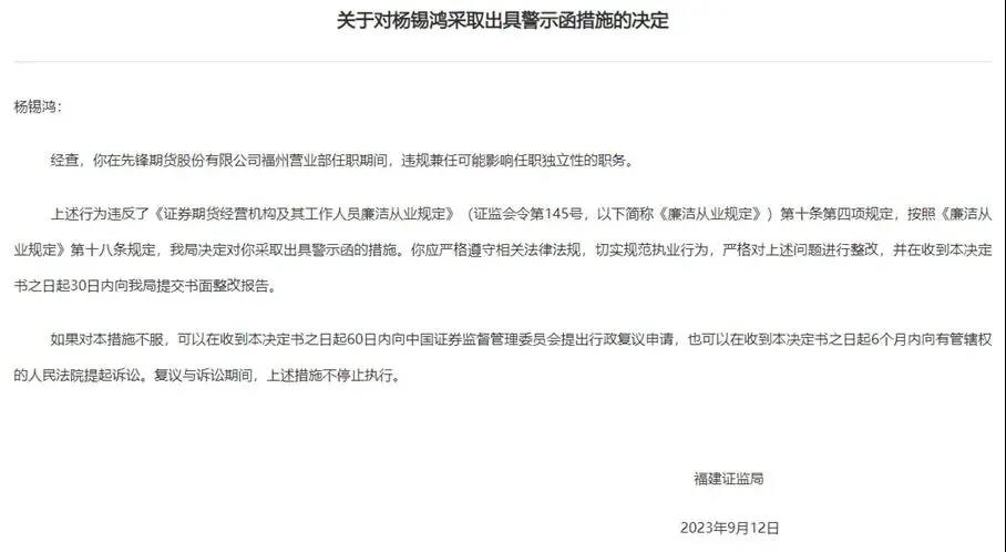 杨锡鸿在先锋期货福州营业部任职期间,违规兼任可能影响任职独立性的职务,上述行为违反了《证券期货经营机构及其工作人员廉洁从业规定》第十条第四项规定。