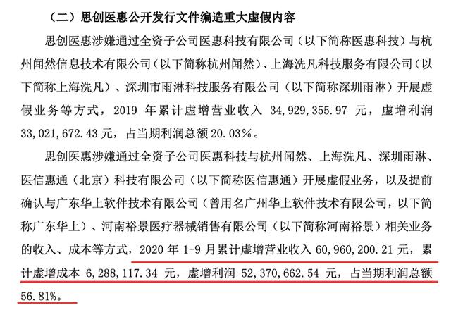 另外,思创医惠涉嫌通过全资子公司医惠科技与杭州闻然等主体开展虚假业务,以及提前确认相关业务收入、成本等方式,2020年1-9月累计虚增营业收入6096万元,虚增利润5237万元,占当期利润总额56.81%。