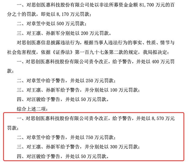 综合上述二项:拟对思创医惠责令改正,给予警告,并处以8570万元??睿欢哉麦抑懈杈?,并处以750万元??睿欢酝趿?、孙新军给予警告,并分别处以300万元??睿欢酝艨ジ杈?,并处以50万元???。
