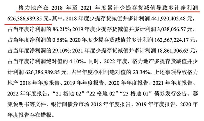 而2022年度,格力地产多提存货减值,并少计利润6.26亿元,占当年度净利润绝对值的23.34%。上述事项导致格力地产2018年度至2022年度报告,部分债券发行公告、募集说明书等文件存在错报。