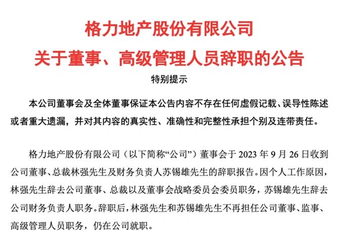 9月26日晚间,格力地产在披露上述《行政处罚事先告知书》信息的同时,也公告了被罚高管辞职的信息。