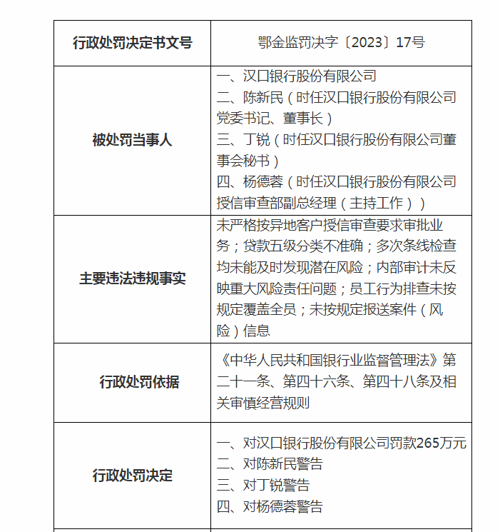 国家金融监督管理总局湖北监管局依据《中华人民共和国银行业监督管理法》第二十一条、第四十六条、第四十八条及相关审慎经营规则,对汉口银行股份有限公司???/span>265万元;对时任党委书记、董事长陈新民、时任董事会秘书丁锐、时任授信审查部副总经理杨德蓉处以警告处罚。