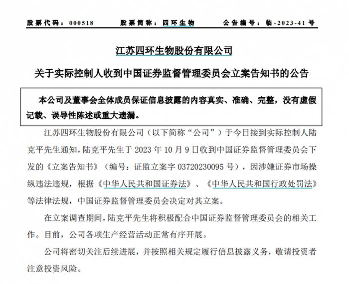 10月9日晚间,四环生物发布公告称,公司于当日收到实际控制人陆克平通知,陆克平于2023年10月9日收到中国证监会下发的《立案告知书》。