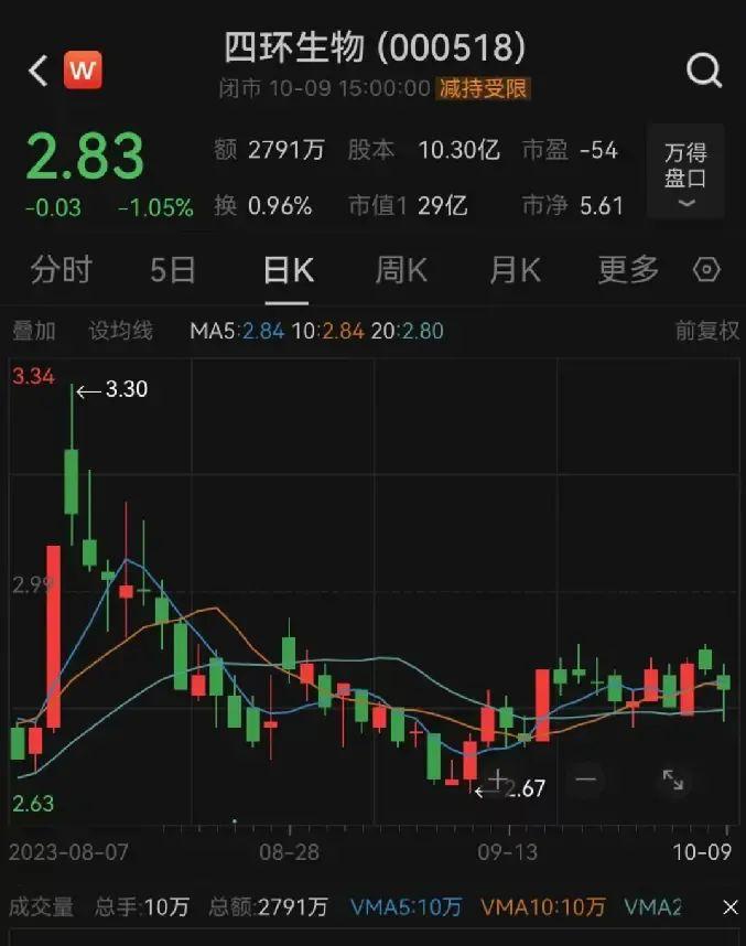 不过,从目前股价表现来看,年内四环生物股价仍在震荡下跌,截至10月9日收盘每股报2.83元,跌幅1.05%,年内跌超10%。而如果未来跌势延续,或将增加补充质押甚至强行平仓的风险。