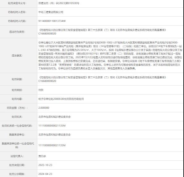 北京市住房和城乡建设委员会近期发布消息显示,中化二建集团有限公司未按照规定组织危大工程验收被处罚。
