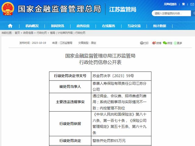 近日,国家金融监督管理总局江苏监管局发布多个行政处罚信息公开表显示,泰康人寿保险有限责任公司江苏分公司和泰康养老保险股份有限公司江苏分公司被处罚。
