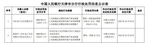 行政处罚信息公示表显示,中汇支付因未按规定办理特约商户资金结算、未按规定落实特约商户实名制管理、未按规定设置收单银行结算账户,于10月20日被人民银行天津分行予以警告,没收违法所得1328.11万元,???/span>6762.55万元。