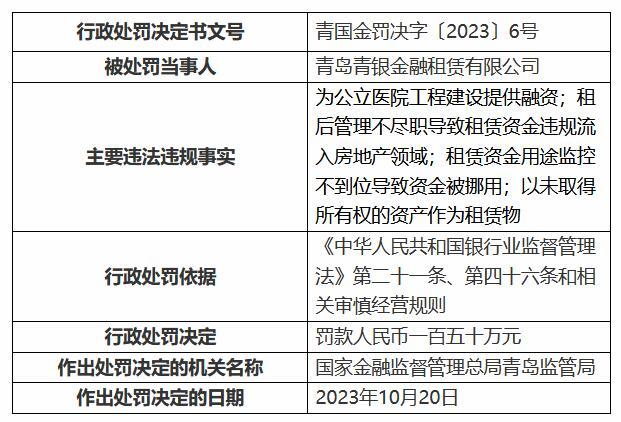 国家金融监管总局网站10月31日披露的一则处罚信息显示,青岛青银金融租赁有限公司(下称:青银金租)被罚150万元,作出处罚决定的机关名称为国家金融监管总局青岛监管局,作出处罚决定的日期为10月20日。