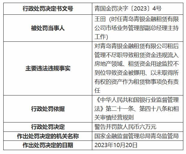 国家金融监管总局网站同日披露的处罚信息显示,王田(时任青岛青银金融租赁有限公司市场业务管理部副总经理主持工作)对青银金租租后管理不尽职导致租赁资金违规流入房地产领域、租赁资金用途监控不到位导致资金被挪用、以未取得所有权的资产作为租赁物事项负有责任。国家金融监管总局青岛监管局对其警告并???/span>6万元。