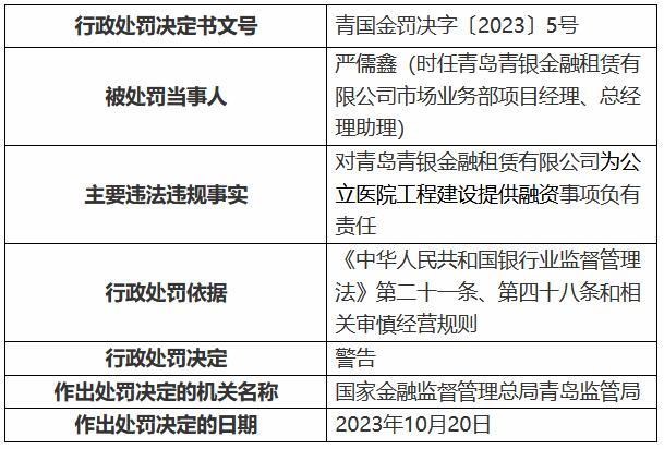严儒鑫(时任青岛青银金融租赁有限公司市场业务部项目经理、总经理助理)对青银金租为公立医院工程建设提供融资事项负有责任。国家金融监管总局青岛监管局对其予以警告。