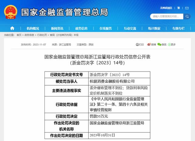 11月7日,国家金融监督管理总局浙江监管局发布公告,杭银消费金融股份有限公司(下称杭银消费金融)因委外催收管理不到位;贷款利率风险定价机制落实不到位被???/span>55万元。