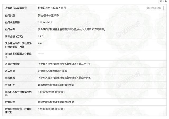 信用中国官网也于近日披露,国家金融监督管理总局陕西监管局10月30日对陕西长银消费金融有限公司(下称陕西长银消费金融)开具罚单。由于对合作机构催收管理不完善,陕西长银消费金融被责令改正,并处以???/span>35万元。