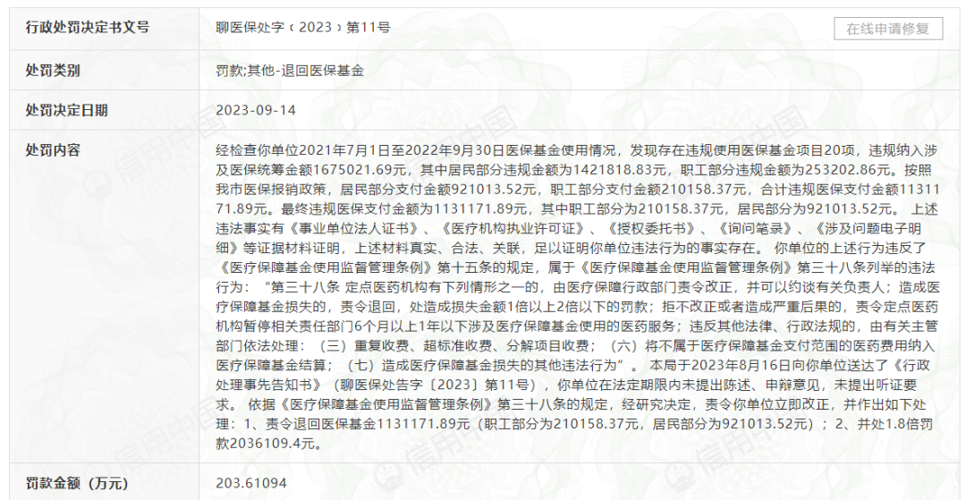 行政处罚决定书显示,经检查,聊城市第四人民医院2021年7月1日至2022年9月30日医?;鹗褂们榭?,发现存在违规使用医?;鹣钅?/span>20项,违规纳入涉及医保统筹金额1675021.69元,其中居民部分违规金额为1421818.83元,职工部分违规金额为253202.86元。按照聊城市医保报销政策,居民部分支付金额921013.52元,职工部分支付金额210158.37元,合计违规医保支付金额1131171.89元。最终违规医保支付金额为1131171.89元,其中职工部分为210158.37元,居民部分为921013.52元。上述违法事实有《事业单位法人证书》、《医疗机构执业许可证》、《授权委托书》、《询问笔录》、《涉及问题电子明细》等证据材料证明,上述材料真实、合法、关联,足以证明你单位违法行为的事实存在。