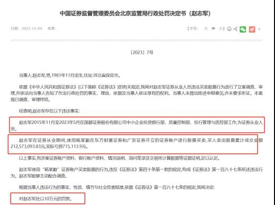北京证监局称,赵志军使用“杨某勤”证券账户买卖股票的行为,违反《证券法》第四十条第一款的规定,构成《证券法》第一百八十七条所述违法行为。不过,北京证监局也表示,赵志军能够主动配合调查,因此根据当事人违法行为的事实、性质、情节与社会危害程度,对赵志军处以10万元的???。
