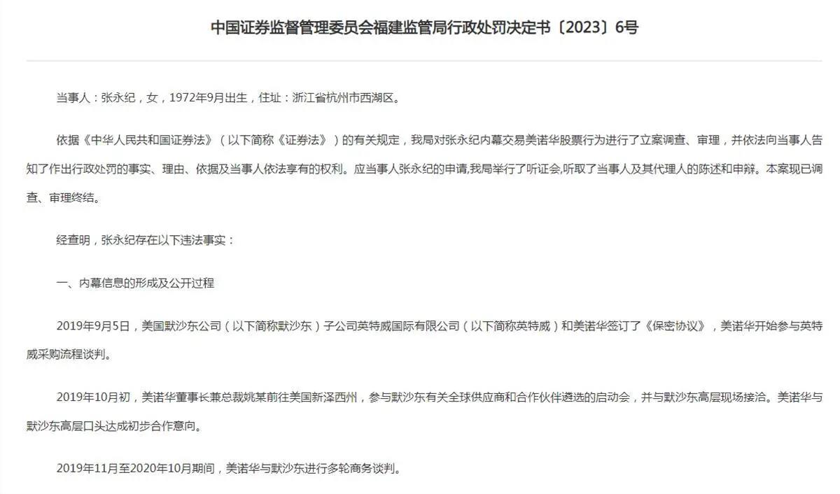 根据福建证监局发布的行政处罚决定书,当事人张某是美诺华董事长兼总裁姚某离婚近20年的前妻,适逢内幕信息的形成期间,美诺华正推进与全球医药巨头默沙东旗下子公司英特威签订十年战略合作协议,姚某主导参与重要合同订立的谈判、决策过程,属于内幕信息知情人,在姚某推动之下,前妻张某遂开启内幕交易。