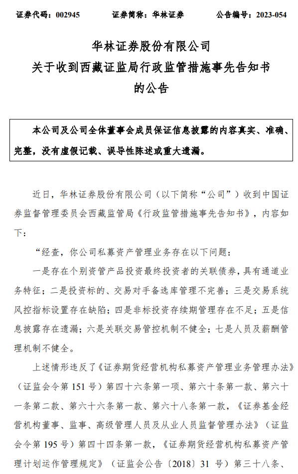 2023年12月29日,华林证券发布公告称,公司收到西藏证监局《行政监管措施事先告知书》,公司的私募资产管理业务存在7个方面问题,西藏证监局决定对公司采取责令改正并暂停新增私募资产管理产品备案6个月的监督管理措施。经查,华林证券私募资产管理业务存在七大问题: