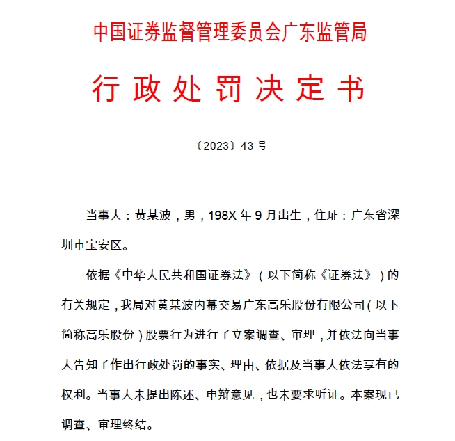 不过,高乐股份停牌前的股价异动,没有躲过监管的“探照灯”。广东证监局在行政处罚决定书中详细叙述了黄某波内幕交易高乐股份股票情况。