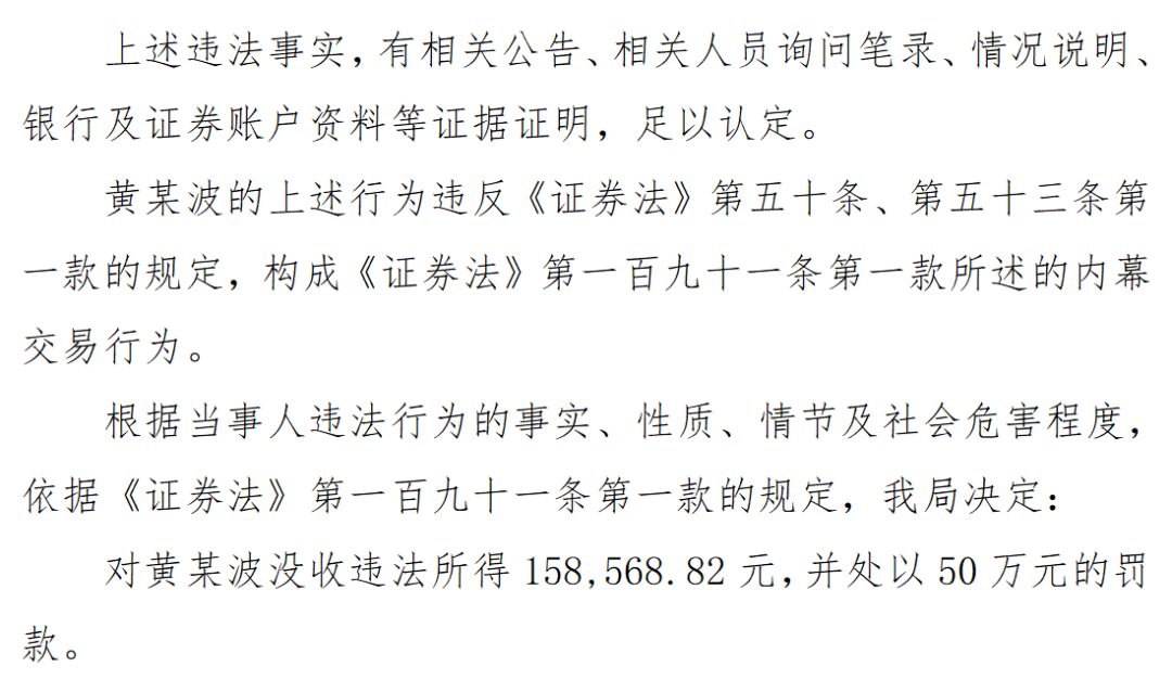 广东证监局决定,对黄某波没收违法所得约15.86万元,并处以50万元的罚款。