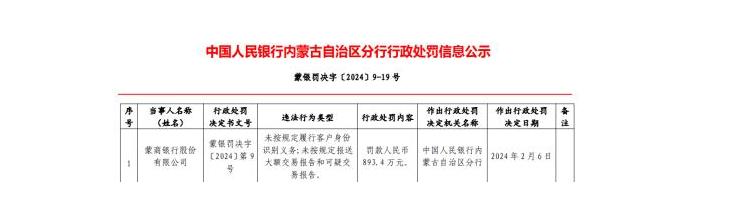 此次罚单采取“双罚制”。除了蒙商银行被给予重罚外,还有10名相关责任人对上述违法行为负有责任,被???万元—6.9万元不等,共计36.6万元。按此计算,此次蒙商银行及多名责任人合计被罚930万元。