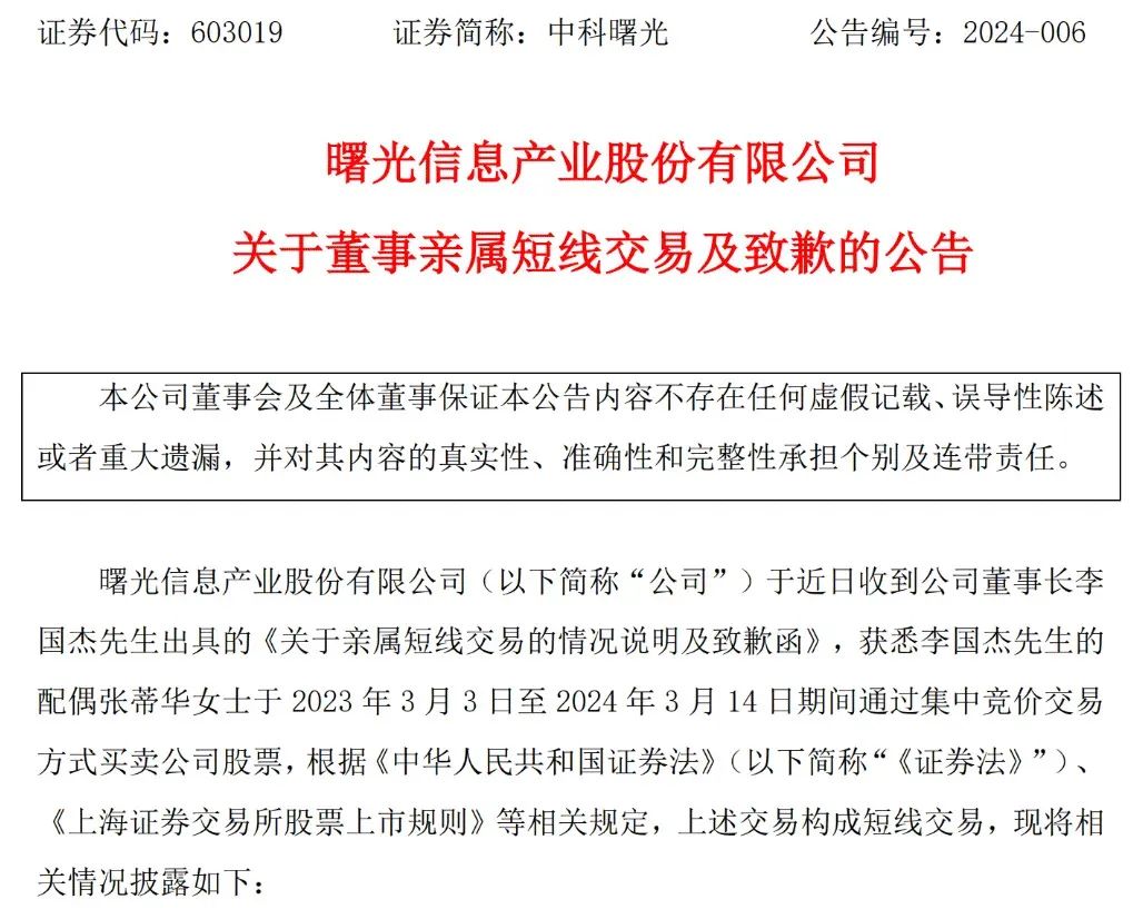 同日,中科曙光公告,近日收到公司董事长李国杰出具的《关于亲属短线交易的情况说明及致歉函》,获悉李国杰的配偶张蒂华于2023年3月3日至2024年3月14日期间通过集中竞价交易方式买卖公司股票,上述交易构成短线交易。