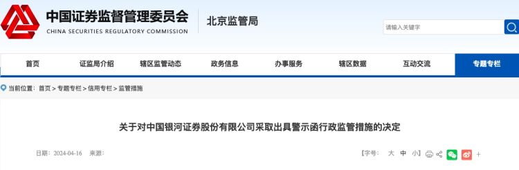 4月16日,北京证监局对中国银河证券股份有限公司(证券简称“中国银河”,证券代码:SH601881,HK06881)及公司时任高级管理人员罗黎明采取出具警示函行政监管措施。