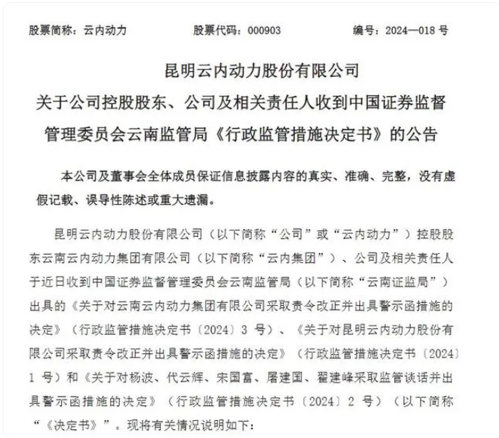 4月17日,云南证监局发布《关于对昆明云内动力股份有限公司采取责令改正并出具警示函措施的决定》和《关于对云南云内动力集团有限公司采取责令改正并出具警示函措施的决定》。