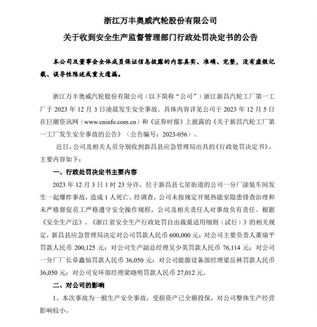 4月18日晚间,浙江万丰奥威汽轮股份有限公司发布公告称,公司近日收到新昌县应急管理局出具的《行政处罚决定书》,因2023年12月3日公司一分厂涂装车间发生一起爆炸事故,造成1人死亡,公司及相关责任人被处以??睢?br />