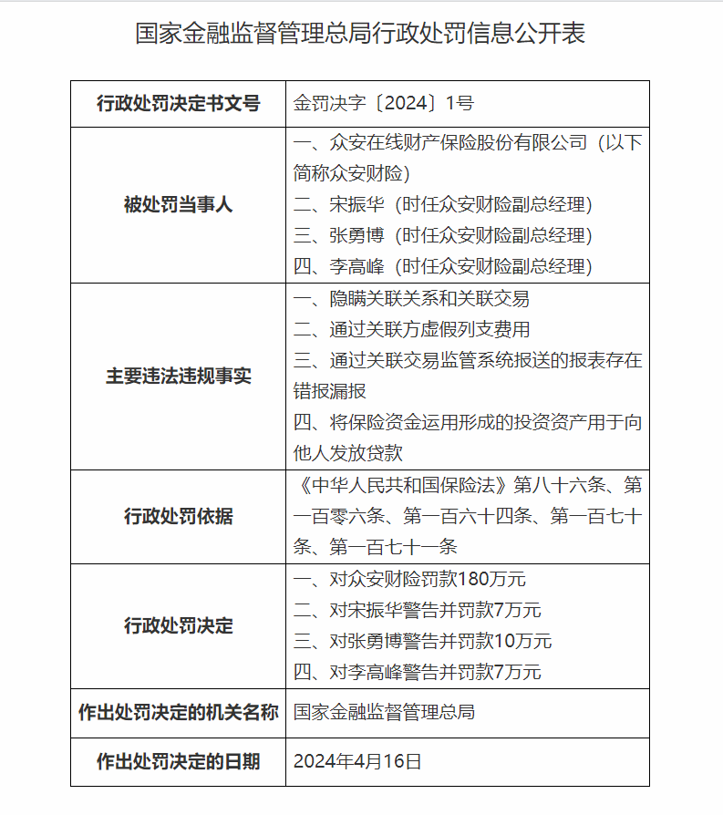 4月24日,国家金融监督管理总局信息显示,开出金罚决字〔2024〕1号罚单,处罚对象为众安在线财产保险股份有限公司。
