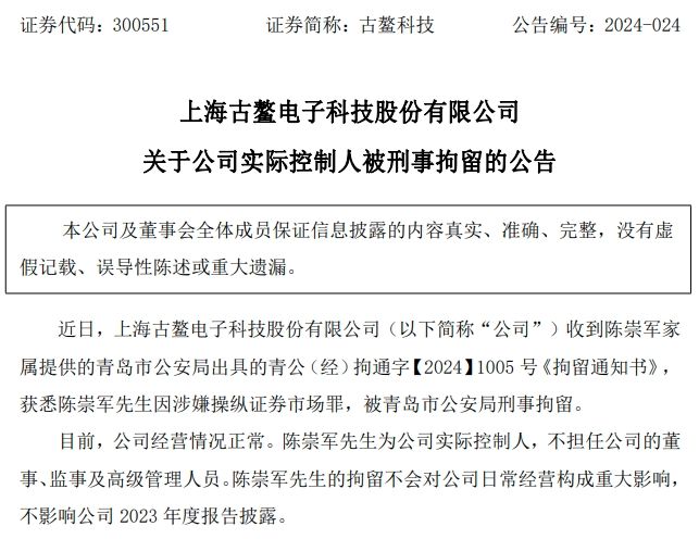 4月25日晚间,古鳌科技(300551)公告,收到实控人陈崇军家属提供的青岛市公安局出具的《拘留通知书》,获悉陈崇军因涉嫌操纵证券市场罪,被青岛市公安局刑事拘留。