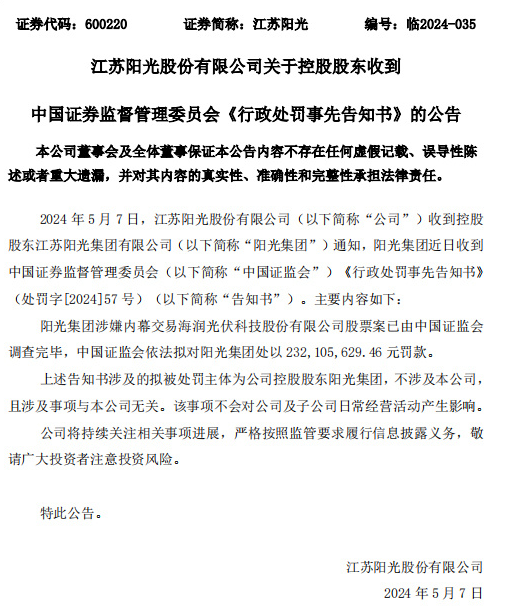 江苏阳光股份有限公司公告,公司收到控股股东阳光集团通知,阳光集团近日收到中国证监会《行政处罚事先告知书》(处罚字[2024]57号)。主要内容如下:阳光集团涉嫌内幕交易海润光伏科技股份有限公司股票案已由中国证监会调查完毕,中国证监会依法拟对阳光集团处以2.32亿元罚款。上述告知书涉及的拟被处罚主体为公司控股股东阳光集团,不涉及本公司,且涉及事项与本公司无关。该事项不会对公司及子公司日常经营活动产生影响。