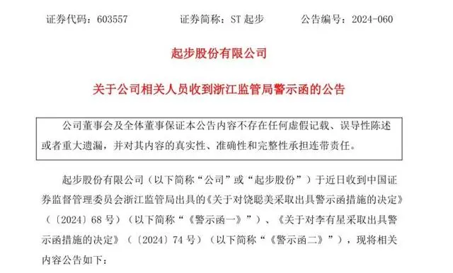 5月8日晚间,ST起步(603557)公告,公司近日收到中国证券监督管理委员会浙江监管局出具的《关于对饶聪美采取出具警示函措施的决定》、《关于对李有星采取出具警示函措施的决定》。