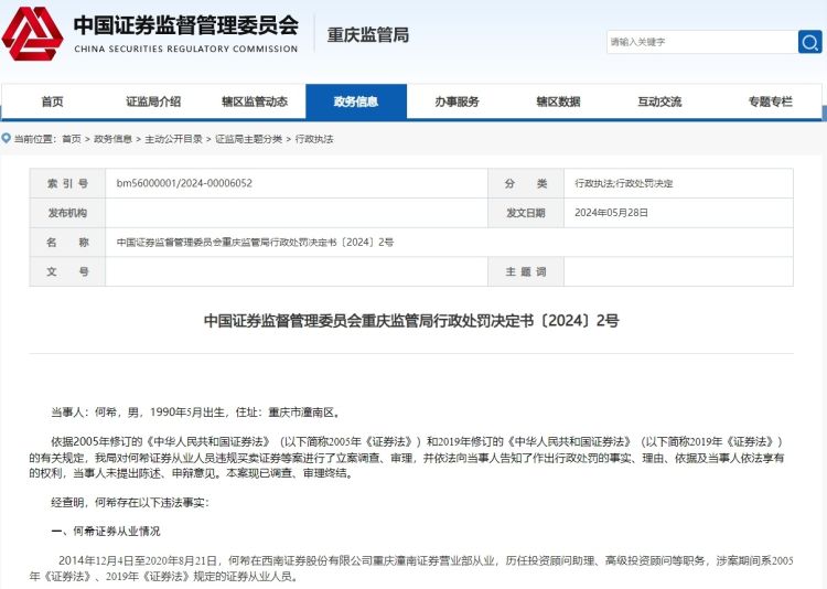继“ 福日电子 ”内幕交易案后,5月28日重庆证监局披露的〔2024〕2号行政处罚决定书显示,西南证券一营业部前员工存在违规买卖证券等行为。