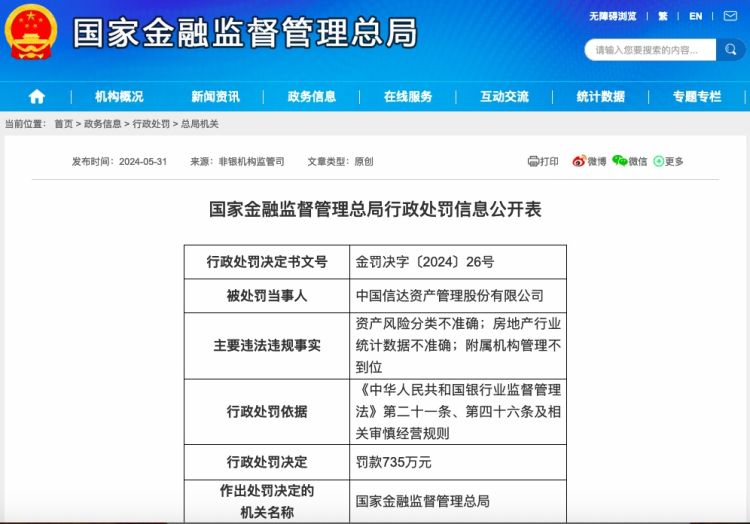 国家金融监督管理总局行政处罚信息公开表显示,中国信达因存在资产风险分类不准确、房地产行业统计数据不准确、附属机构管理不到位等三项违法违规事实,依据《中华人民共和国银行业监督管理法》第二十一条、第四十六条及相关审慎经营规则,国家金融监督管理总局决定对公司给予???35万元的行政处罚。据了解,这也是今年以来,AMC(资产管理公司)中被罚金额最高的一张罚单。