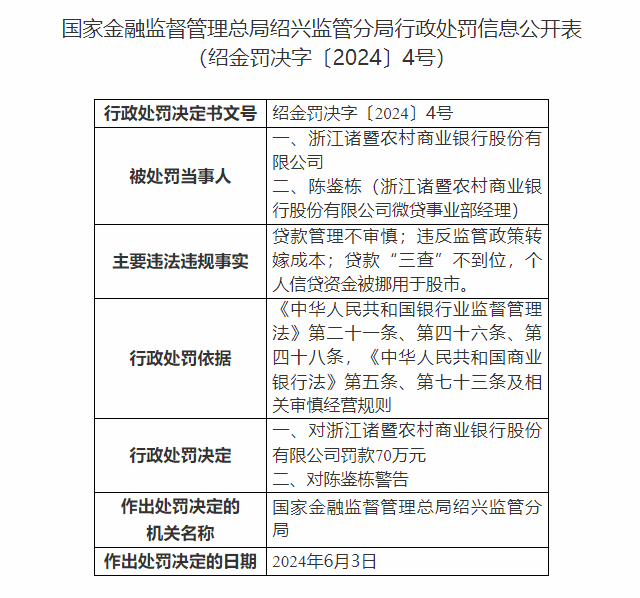 浙国家金融监督管理总局上饶监管分局行政处罚信息公开表显示,浙江新昌浦发村镇银行股份有限公司存在以下违法违规事实:贷款“三查”不到位,贷款资金被挪用于股市;贷款管理不审慎。