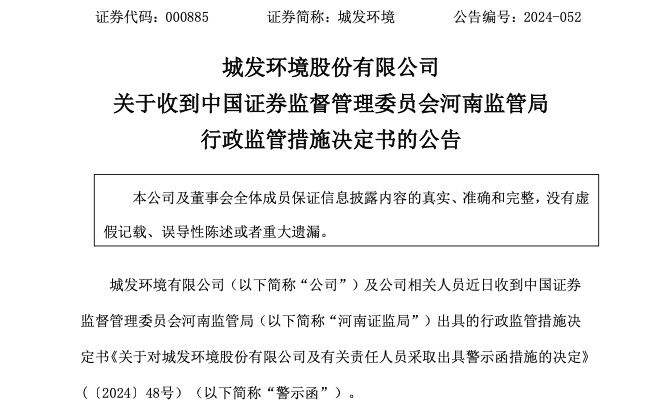 城发环境(000885)6月11日晚间公告,因未及时披露关联方非经营性占资事项,公司及公司相关人员近日收到中国证券监督管理委员会河南监管局(以下简称“河南证监局”)出具的行政监管措施决定书《关于对城发环境股份有限公司及有关责任人员采取出具警示函措施的决定》(〔2024〕48号)(以下简称“警示函”)。